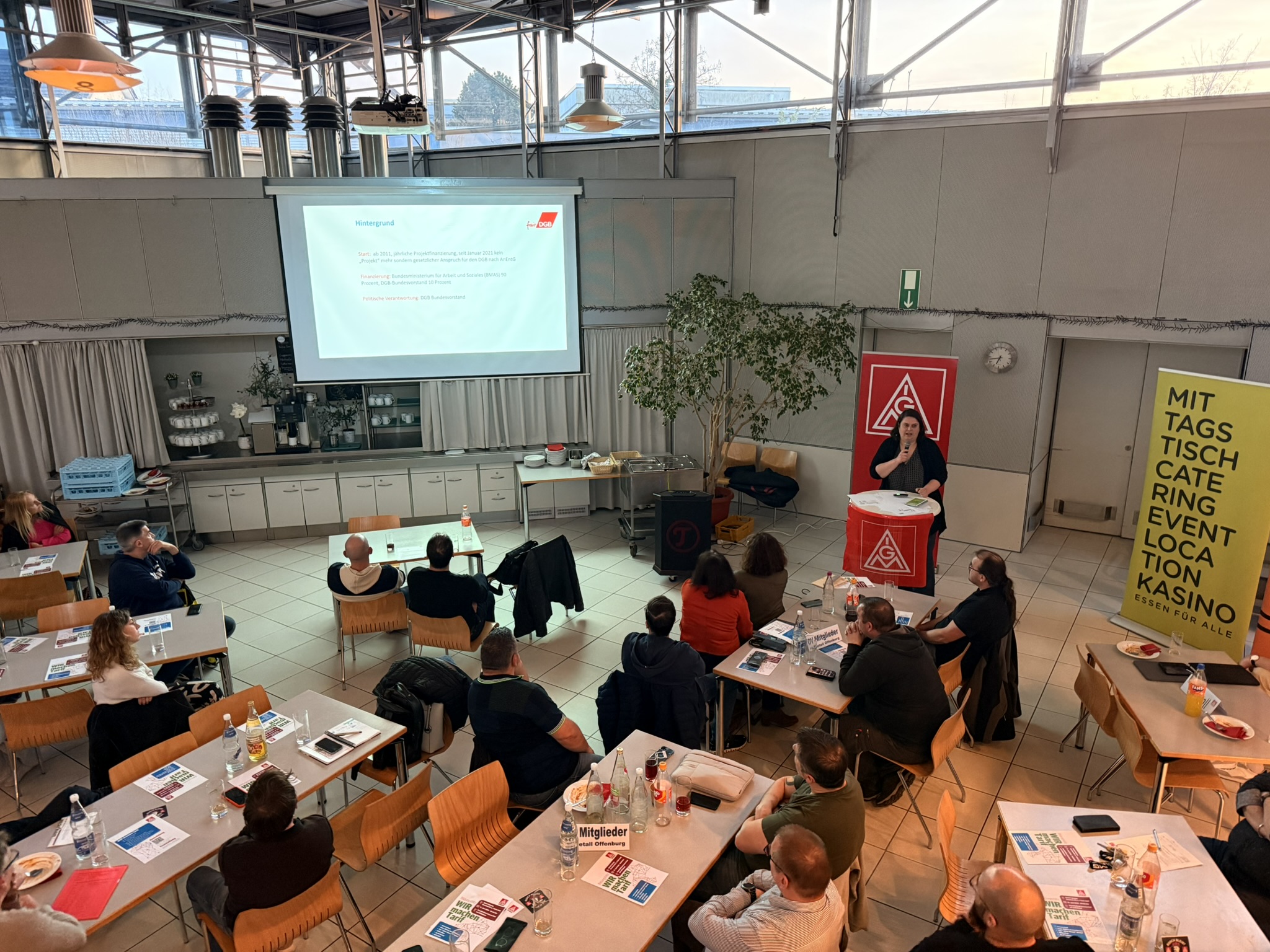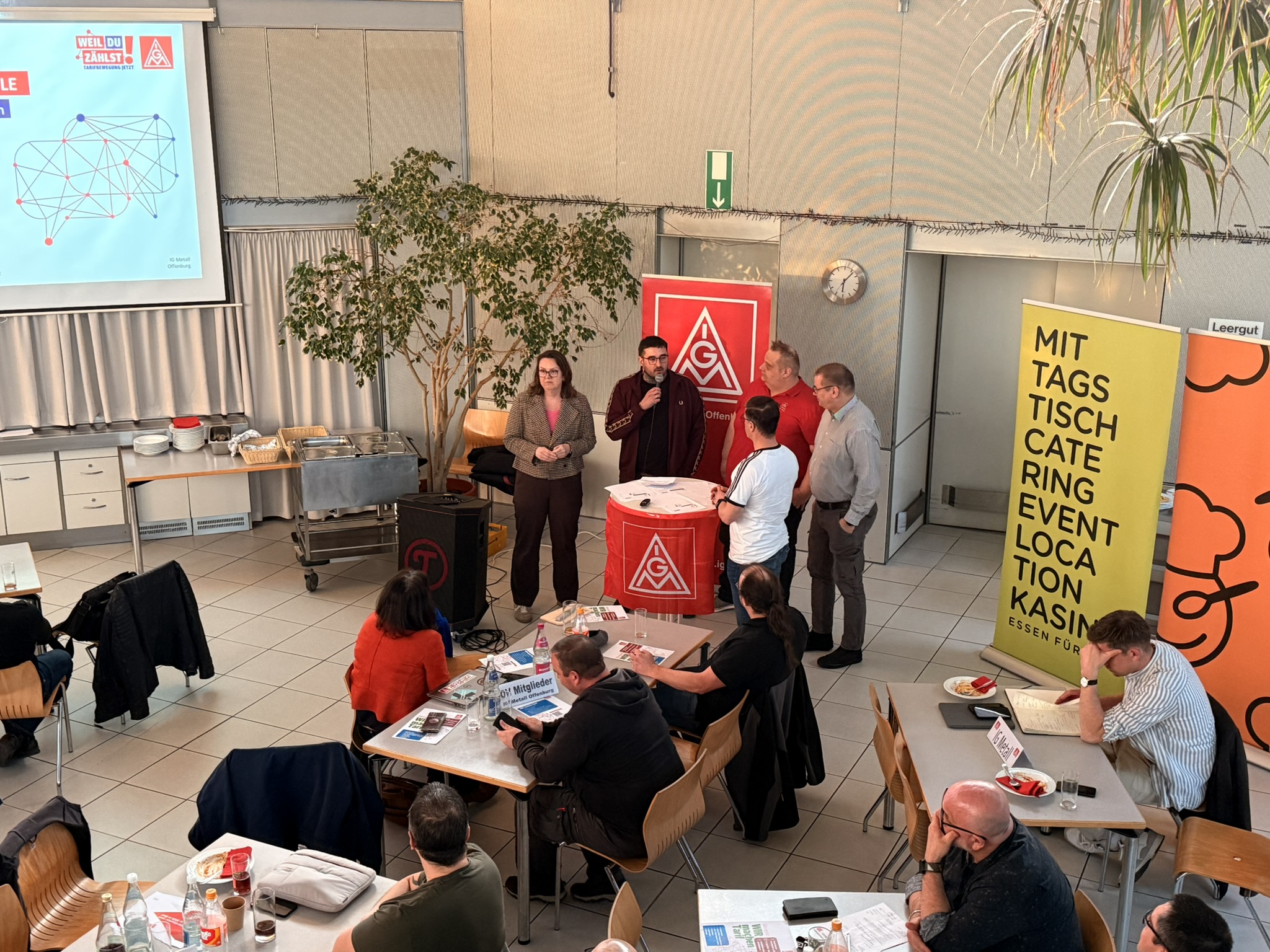 Einen weiteren zentralen Punkt bildete der Bericht von Felix Eimert, der erste Erkenntnisse aus den aktuell laufenden Betriebsratswahlen vorstellte. Bereits die Hälfte der betreuten Betriebe hat gewählt. Auffällig ist eine gestiegene Wahlbeteiligung im Vergleich zur letzten Wahl vor vier Jahren. Zudem gibt es mehr Kandidierende, die sich jedoch auf insgesamt weniger Mandate verteilen. Eine Zunahme an Listenwahlen ist ebenfalls zu verzeichnen – allerdings ohne offen gegnerische oder gewerkschaftsfeindliche Listen in unserer Region.