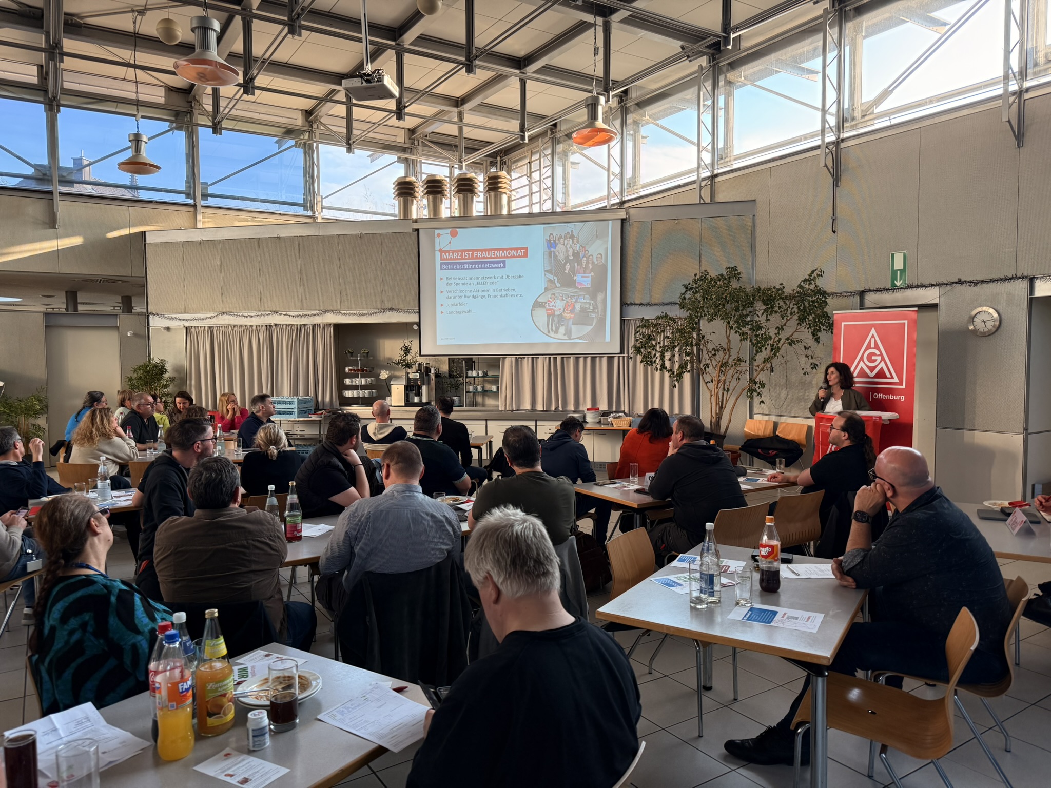 Maja Reusch berichtete in ihrem Geschäftsbericht über die Arbeit der IG MEtall Offenburg in den letzten drei Monaten, gab aber auch einen Ausblick auf die kommende Zeit. Im Mittelpunkt der ersten Delegiertenversammlung des Jahres stand die Tarifbewegung in der Metall‑ und Elektroindustrie. Die Geschäftsstelle hat die Tarifrunde bereits detailliert vorbereitet. Besonders wichtig ist in diesem Jahr, die Forderungsdiskussion stärker in die Betriebe zu tragen. Durch mehrere Ansprachetage im Frühsommer soll mit möglichst vielen Beschäftigten ins Gespräch gekommen und ihre Erwartungen und Anliegen aufgenommen werden.